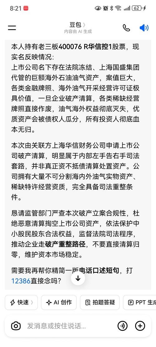 $R华信控1(SZ400076)$喊空的人是否别有用心?今天成交1730万股,底下还有540万股等着买进,说明有人在低价吸筹。持有华信控的股友成本基本都高于0.07元,此时卖出华信控可惜了,好像四九年加入国军。华信控的资产被冻结、查封、扣押了,重整是唯一出路。按公告的说法可能下周还有最后一个交易日了,破产公告送达生效后即停止交易,望珍惜手中的筹码。