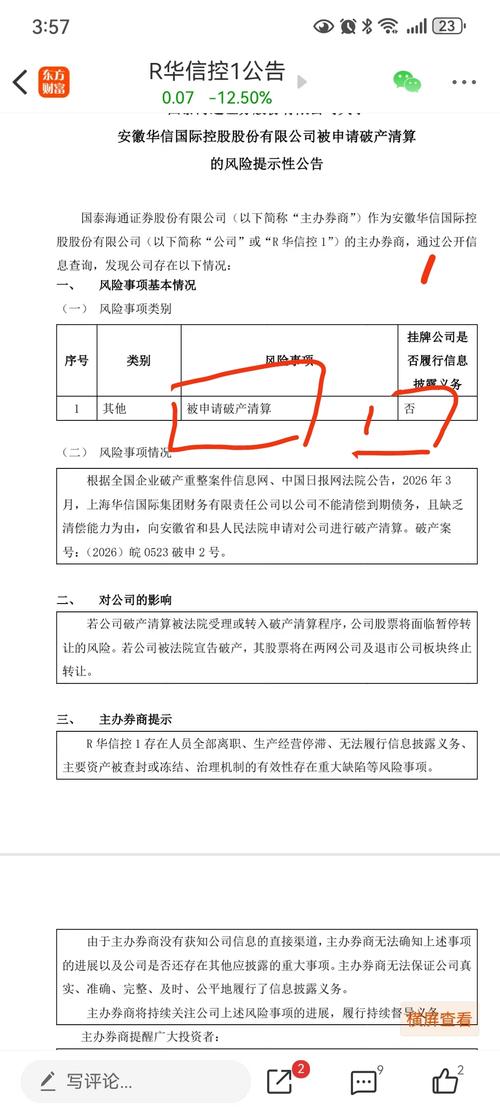 公告 R华信控1:国泰海通证券股份有限公司关于安徽华信国际控股股份有限公司被申请破产清算的风险提示性公告