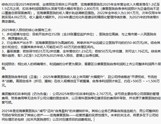 - 综合2022至2025年的年报、业绩预告及相关公开信息,览海康复医院在2025年全年营业收入大概率落在1.2亿至1.5亿元之间,扣非净利润层面则从深度亏损大幅收窄至约-2,800万元(康复医院自身净利润预计为正值但尚不足以覆盖总部层面费用)。览海康复医院的收入增长轨迹清晰且强劲。2022年全年收入为3,901万元,次年仅用半年就实现4,062万元,收入量级大幅跃升。2024年通过优化科室建设和精细化管理持续改善,为2025年的持续增长奠定基础。 2025年收入预估的核心依据有三点: 1、床位规模与定位:目前开放床位352张(含28张重症监护床位),医院定位高端,与上海市第一人民医院合作,病源基础扎实。 2、行业单床产出水平:览海康复医院作为高端机构,其单床年产出远超公立医院平均的约50-80万元/床。结合其定价和定位,估算其单床年收入可能在40万-60万元的合理区间内。 3、量级推算:若按保守的35万元/床估算,全年营收约1.23亿元;若按50万元/床估算,则可达1.76亿元。综合其增长趋势,取1.2亿至1.5亿元作为2025年收入预估,逻辑上站得住脚。 利润预估:相比收入的明确增长,利润端的分析更为复杂,需要区分康复医院自身利润和上市公司整体利润两个层面。 康复医院自身利润(正值):2025年康复医院收入较上年同期"大幅提升",且公司持续推进"开源拓收、节流控本"战略。高固定成本(折旧、摊销)在收入规模效应下被摊薄,自身净利润预计转正,约在+500万 ~ +1,500万元。 集团整体扣非净利润(仍为负值):公司2025年预计扣非净利润为-2,767万元。该亏损主要由母公司层面的管理费用、财务费用等无法向子公司分摊的固定成本,以及骨科医院等在建项目的费用所导致,并非源于康复医院的经营亏损。 2025年是览海康复医院从"减亏"迈向"自身盈利"的关键转折年。其核心业务已具备自我造血能力,而公司整体的亏损收窄则反映了其核心资产——览海康复医院——经营质量的实质性提升。未来的关注点,将更多在于公司如何处理历史包袱(如禾风医院债权)以及对在建项目的战略规划。