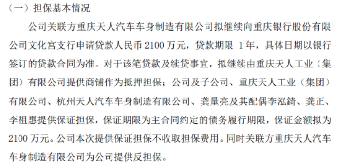 挖贝网12月7日,天人底盘(870502)近日发布公告,公司关联方重庆天人汽车车身制造有限公司拟继续向重庆银行股份有限公司文化宫支行申请贷款人民币2100万元,贷款期限1年,具体日期以银行签订的贷款合同为准。对于该笔贷款及续贷事宜,拟继续由重庆天人工业(集团)有限公司提供商铺作为抵押担保;公司及子公司、重庆天人工业(集团)有限公司、杭州天人汽车车身制造有限公司、龚量亮及其配偶李泓锜、龚正、李祖惠提...