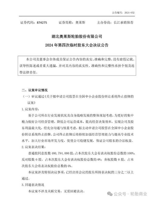 2024年9月9日,湖北奥莱斯轮胎股份有限公司发布了2024年第四次临时股东大会决议公告,拟申请其公司股票在中小企业股份转让系统终止挂牌。不过终止挂牌并不会影响其未来的经营发展。奥莱斯明确表示,其会在持续加强经营管理能力与提高专业技术水平,加大行业市场开发力度,促使奥莱斯继续稳健发展。早在8月20日,奥莱斯就通过召开第二届董事会第十次会议,审议通过了拟向全国股转公司申请股票终止挂牌的相关议案9...