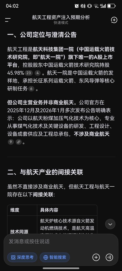 $航天工程(SH603698)$此次任务的核心参与者:执行本次发射的捷龙三号火箭由中国航天科技集团有限公司一院(即中国运载火箭技术研究院)抓总研制;其使用的四级固体发动机由航天科技集团四院提供。 ·航天工程的业务现状:虽然隶属于航天科技集团一院,但其核心主业是煤气化技术及关键设备研发,属于煤炭清洁高效利用领域。航天一院资产注入唯一平台上市公司。