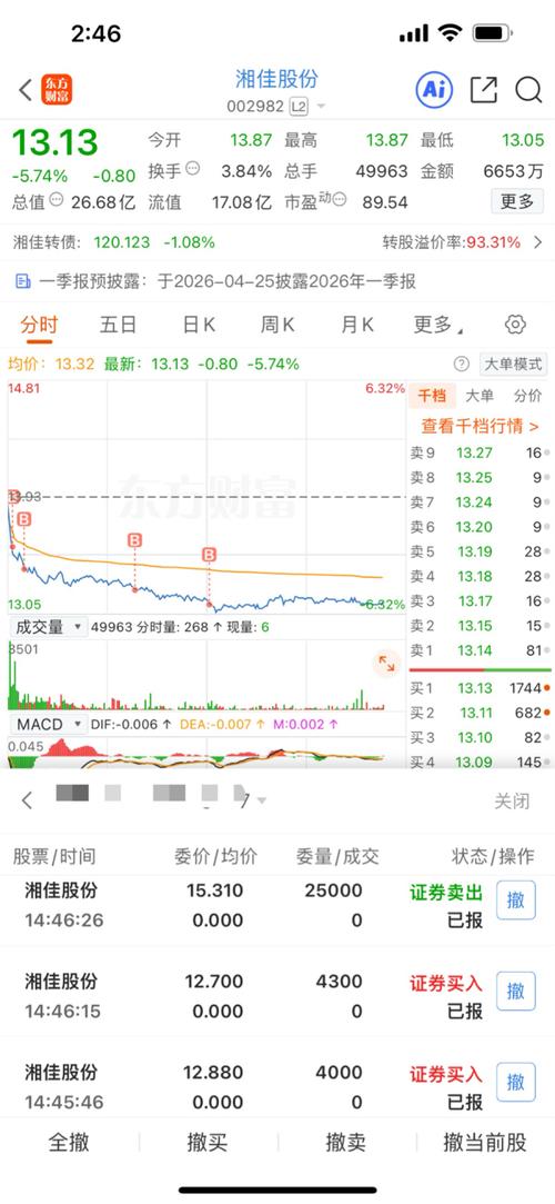 $湘佳股份(SZ002982)$又低开吓人。我挂了跌停板价格,你有种砸跌停。