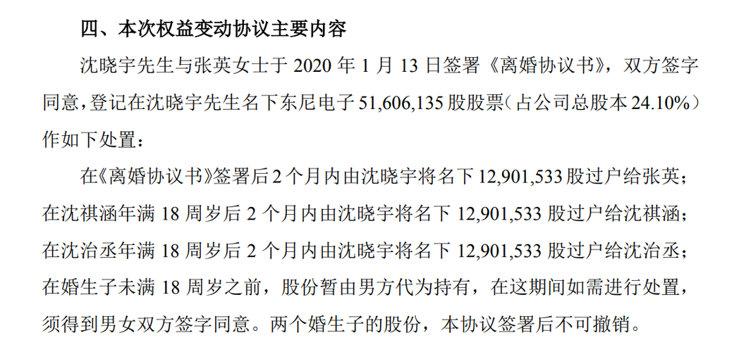 沈晓宇持有的38,704,602股中,有25,803,066股是代两个儿子持有的,儿子年满18周岁后2个月内就要过户。