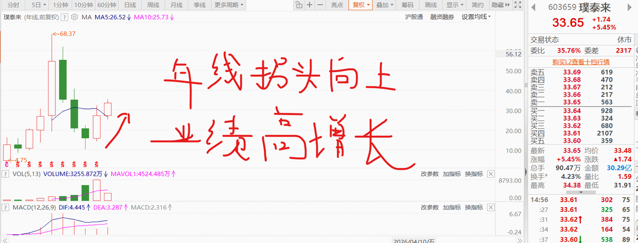 璞泰来业绩增长,年线已经拐头向上,周线放量创新高走势,走势健康,有业绩支撑,长线白马王子。