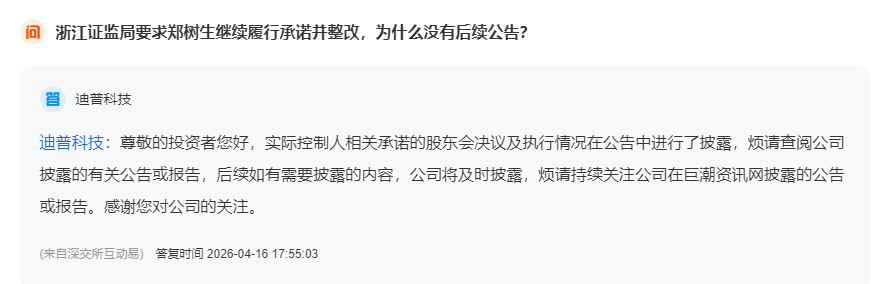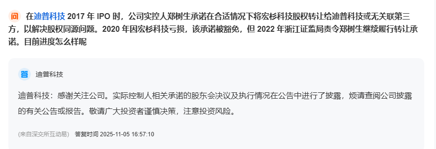 郑树生IPO时《关于转让杭州宏杉科技股份有限公司股权的承诺函》原文(完整披露版) 承诺主体:郑树生(迪普科技控股股东、实际控制人) 承诺时间:迪普科技IPO审核及上市期间(2017-2019年) 承诺文件:《关于转让杭州宏杉科技股份有限公司股权的承诺函》,披露于迪普科技《首次公开发行股票并在创业板上市招股说明书》及2020-045号公告 承诺全文: 在宏杉科技未来经营状况良好且有利于维护迪普科技股...