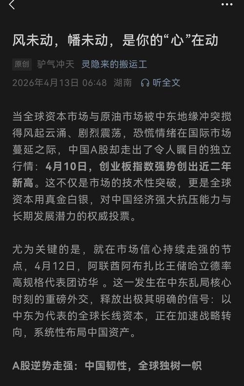 $芯朋微(SH688508)$当全球资本市场与原油市场被中东地缘冲突搅得风起云涌、剧烈震荡,恐慌情绪在国际市场蔓延之际,中国A股却走出了令人瞩目的独立行情:4月10日,创业板指数强势创出近二年新高。这不仅是市场的技术性突破,更是全球资本用真金白银,对中国经济强大抗压能力与长期发展潜力的权威投票。 尤为关键的是,就在市场信心持续走强的节点,4月12日,阿联酋阿布扎比王储哈立德率高规格代表团访华。这一...