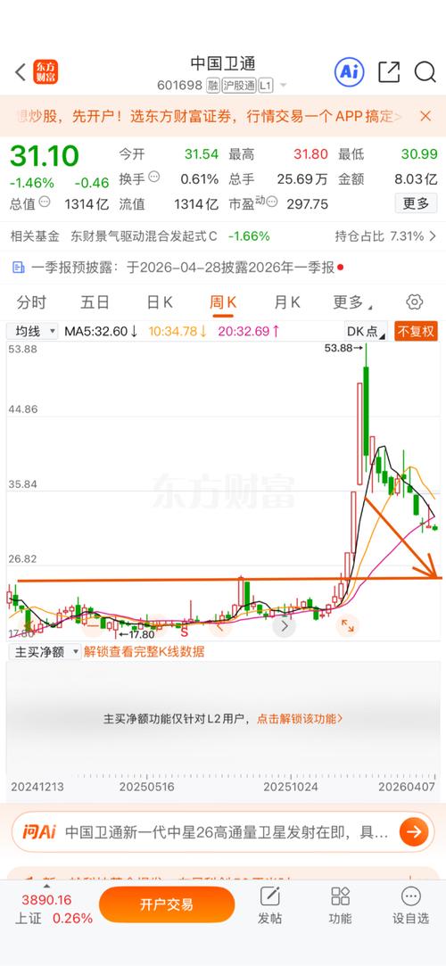 晚间话中国卫通:今日回顾与明日展望 今日回顾 早盘31.64元开,最高冲至32.99元,最低下探31.64元,最终收盘32.99元,上涨6.08%,单日振幅4.34%,股价全天运行区间集中在31.64-32.99元。全天成交量48.88万手,成交额15.84亿,换手率1.16%,量比1.23,资金活跃度较前一交易日有所提升;委比-48.53%,卖盘力量稍占优势,内盘成交19.56万手,外盘成交29...