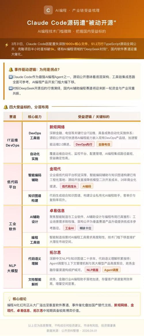 ClaudeCode源码遭”被动开源”:AI编程技术门槛骤降,把握国内受益标的! 3月31日,ClaudeCode因配置疏漏致1900+核心文件、51.2万行TypeScript代码悉数公开,半小时内相关克隆项目星标破5k。此次事件性质类似AI领域的”DeepSeek时刻”——顶级AI编程工具的实现逻辑被迫公开,将加速全球AI编程生态进入高速扩张期,国内具备技术积累的软件标的迎来重大催化。 1⃣新...