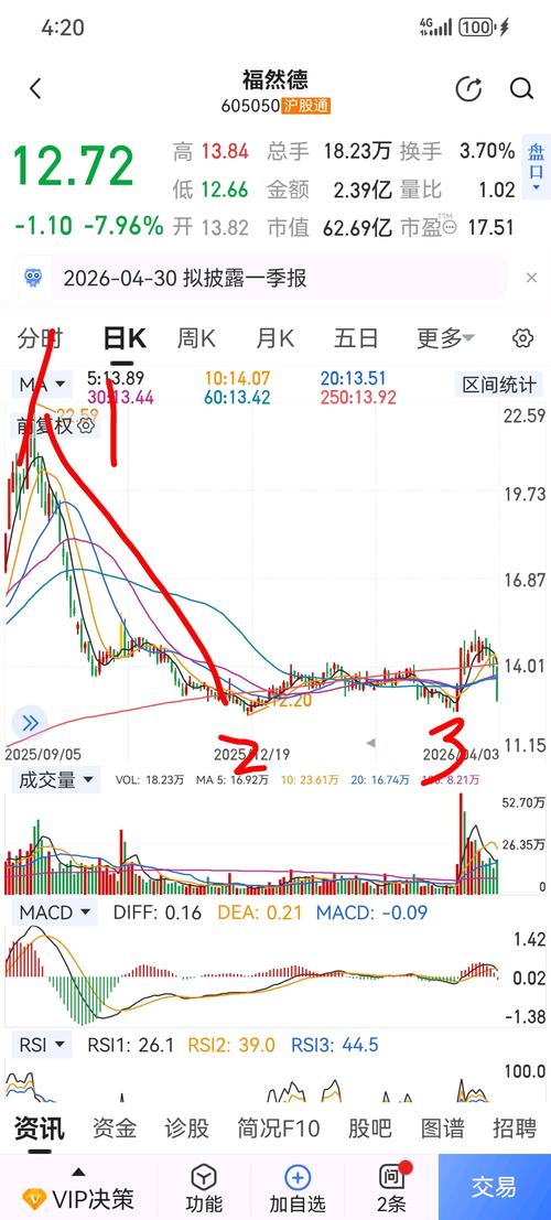 $福然德(SH605050)$605050福然德4月7日及后续走势分析:下图是日线图,你们能看出什么么?这种票很多,一波冲高后回调什么能关注?1到2看都不用看,那现在为啥现在又关注了?主要是3后走了一波,在去年10月30日压力附近开始回调了,这波代表什么?代表在下降通道中建立了一个低点越来越高趋势向上的形态,所以这才是关注的核心关键。做这种票对短线选手有两种操盘手法,第一种就是等回调3处低点去建立...