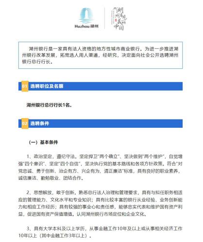 【湖州银行公开选聘总行行长】3月29日,据湖州市人民政府新闻办公室“湖州发布”微信公众号,湖州银行公开选聘总行行长。选聘公告称,湖州银行是一家具有法人资格的地方性城市商业银行。事实上,湖州银行冲刺A股已有3年。早在2019年3月,湖州银行便行向浙江证监局递交了辅导备案公示文件。2020年1月,湖州银行便首次递交招股书,拟登陆上交所主板。2019年至2022年上半年,该公司实现营收分别为17.53...