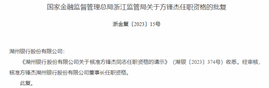 【湖州银行董事长方锋杰任职资格获批】国家金融监督管理总局网站披露,国家金融监督管理总局浙江监管局核准方锋杰湖州银行股份有限公司(下称“湖州银行”)董事长任职资格。(国家金融监管总局网站)