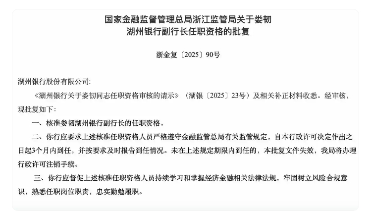 【湖州银行副行长娄韧任职资格获核准】