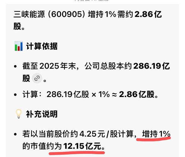 $三峡能源(SH600905)$ 难怪不公告,增持百分之一要12亿多,最低增持期限只有7亿左右,大股东3月份增持最低期限也达不到公布的要求! 今天收盘后大概率公布完成公告! 央企完不成的概率极低,毕竟三峡是电力龙头! 然后大股东已经增持完了,在今天收盘后或者晚上公布!