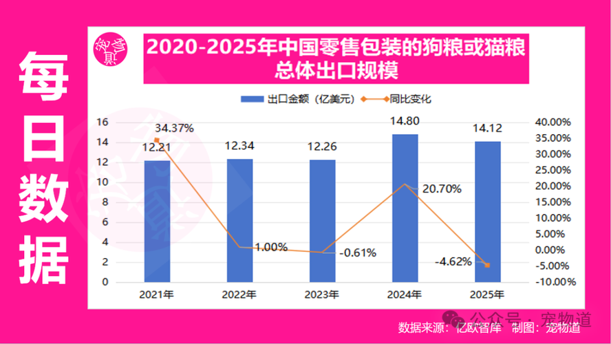 中国宠物食品出海,不再是简单的产能输出。 近日,亿欧智库发布《中国宠物食品行业出海国别机会洞察报告》,报告指出,中国宠物食品产业正加速迈向高质量、国际化发展阶段。2021-2025年,中国零售包装的狗粮或猫粮整体出口数据(HS230910)出口金额整体呈现波动上升趋势:出口额从2021年的12.21亿美元稳步攀升至2024年的14.80亿美元,同比增长20.70%;尽管2025年小幅回落至14.1...