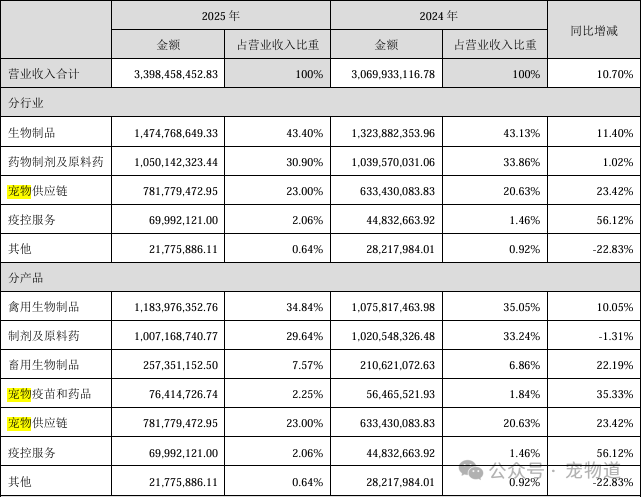 积极顺应宠物经济发展趋势进行产业布局,加快中国动保企业出海的步伐。 宠物道消息,3月31日晚间,瑞普生物(300119.SZ,市值81.01亿元)发布2025年年度报告。报告期内,公司实现营业收入33.98亿元,同比增长10.70%;实现归母净利润4.01亿元,同比增长33.18%。其中,宠物板块实现收入8.58亿元,同比增长24.39%。 资料来源:瑞普生物财报 财报披露,公司把握宠物经济崛起机...