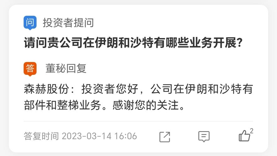 【问】董秘你好,据悉公司在中东地区如伊朗沙特等地均有业务合作,此前参与了伊朗地区的雅戴大楼建设,请问是否属实?【答】森赫股份:尊敬的投资者,您好,公司在中东部分地区有开展电梯业务合作并实现项目落地,相关业务均属于公司海外市场正常经营布局。具体项目信息请以公司公开披露内容为准。感谢您的关注!