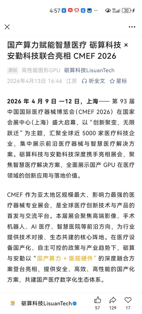 $东芯股份(SH688110)$ 国产算力赋能智慧医疗砺算科技×安勤科技联合亮相CMEF2026 原创高性能图形GPU高性能图形GPU砺算科技LisuanTech2026年4月13日16:46江苏35人在小说阅读器读本章去阅读在小说阅读器中沉浸阅读2026年4月9日—12日,上海——第93届中国国际医疗器械博览会(CMEF2026)在国家会展中心(上海)盛大启幕,以“创新聚变,无限跃迁”为主题,汇...