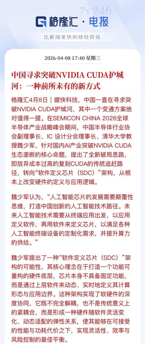 半导体赛道,正上演一场“换道超车”的大戏! 今天,在刚刚结束的SEMICONCHINA2026上,清华大学教授魏少军抛出了一个震惊业界的颠覆性观点:不要再走复刻英伟达CUDA的老路! 英伟达之所以称霸全球AI,靠的不是一块显卡,而是它的CUDA生态。打个比方:CUDA就像英伟达为自己的芯片建的“操作系统”,全球几百万开发者住在里面,你想进去,就得买它的硬件。这座城堡,已经修了近二十年。 过去几年,...