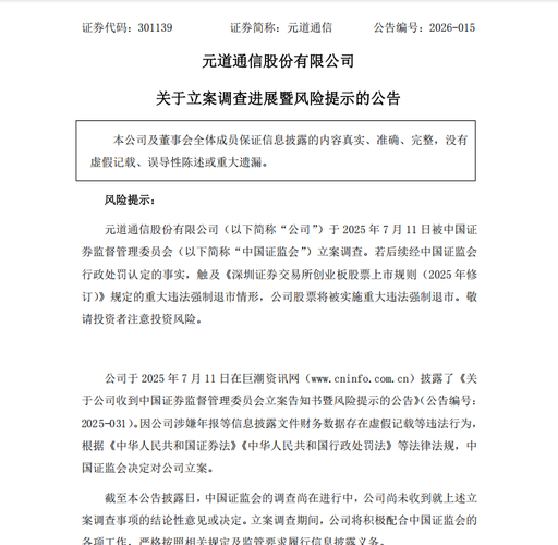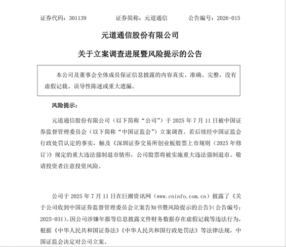 公告 元道通信:关于立案调查进展暨风险提示的公告