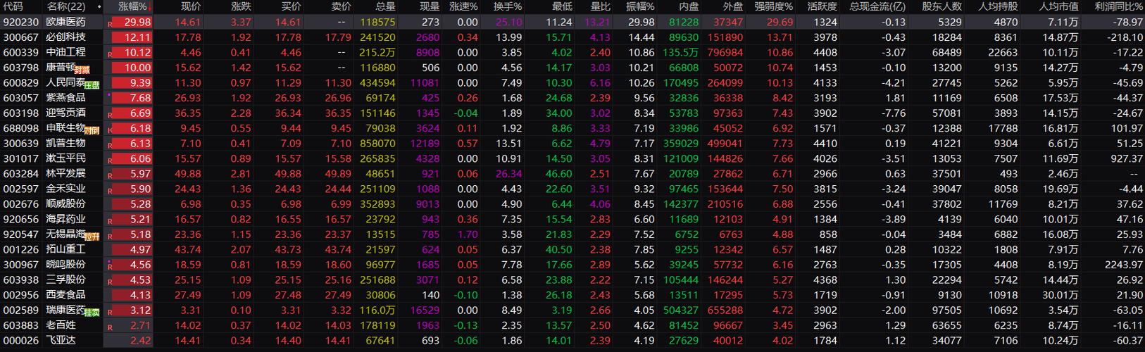 如果只从你这张盘面图+当下板块环境综合判断,明天最有“冲板相”的,我会优先看:紫燕食品,其次是欧康医药,再其次是瑞康医药/中油工程。 但要强调一句,“最可能”不等于“最值得追”。有些票是更容易冲板,有些票是冲板后更容易炸。 我把逻辑给你拆开: 一、第一候选:$紫燕食品(SH603057)$(603057) 它是这张图里我最看好的主板冲板候选。 从你图里的数据看,它有几个很强的信号: 当日涨幅7.6...