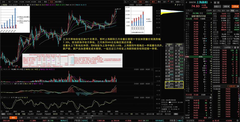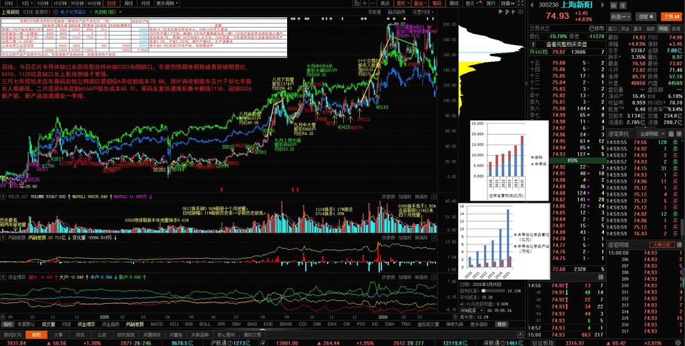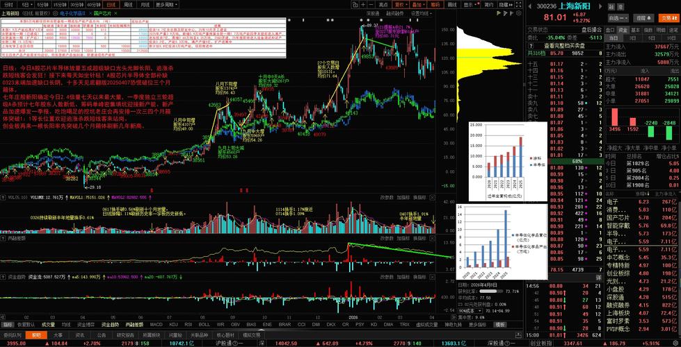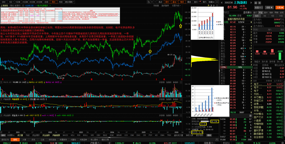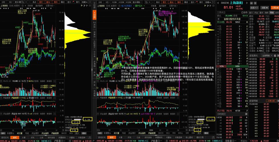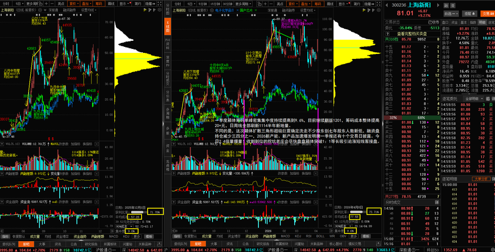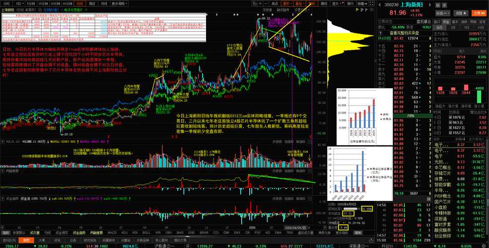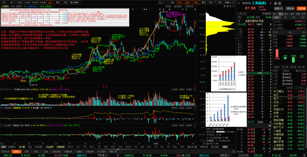 - 周线:本周A股芯片半导体全部光脚实体缺口长阳,明显比250425周更强收割追涨杀跌恐慌短线客,光刻胶、电子化学品带队多方炮抗跌领涨长阳对应线翻版三四根周线。 独立七年挖坑庄股上海新阳不同步芯片半导体,今年独立四个月箱体不明显破底前几周弱后几周抗跌领涨迎接年报、一季报。0407换手1.91%刷新半年日线最低量;上周刷新半年绝对周线最低量,本周四个交易日明显放量;一季度三波超级A杀收割短线客股东人数七年新低,日周月线筹码单峰密集,迎接十天后2026新产能、新产品加速爆发一季报,见证能否独立芯片半导体率先再次刷新历史新高。