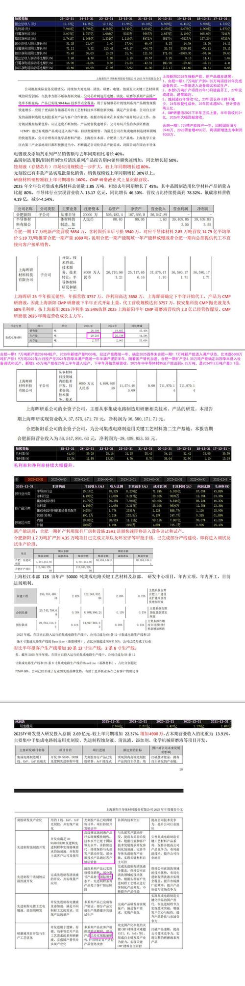 2025新产品最大亮点蚀刻液、研磨液大幅放量,特别是研磨液下半年放量,上海晖研生产。而合肥一期扩产4.35万吨项目中这两个系列产品产能是重点,本部1.9万吨产能中对应产能很低。年报显示即将进入设备调试和试产,预计上半年进入投产,一年后满产。上海新阳五个系列高端芯片关键材料全覆盖14nm,卡脖子客户都是大厂。