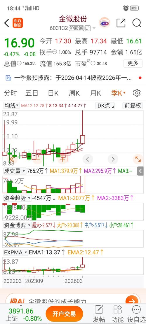 $甘肃板块(BK0152)$ 共参考7篇资料 金徽股份(603132)是当前被多次提及符合“长期初始底部揭盖”“季K线仙人指路”特征的典型牛势股,具备助力上证指数突破的潜力。 该股历经四年缓升整固,股东户数持续处于历史低位,前十大股东持股比例超90%,筹码高度集中,主力控盘特征显著。2026年春分前后完成洗盘,股价放量突破长期压制线,形成明确的“揭盖”信号,标志着从量变到质变的转折。 在技术形态上...