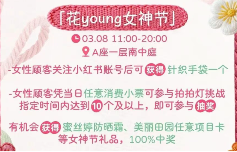路过商场被女神节活动狠狠圈粉! 3月8日11:00-20:00是专属女神福利场, 女生关注小红书就能免费领春日针织手袋,软乎乎超有氛围感~ 任意消费还能玩拍拍灯挑战赛,100%中奖,防晒霜、护理卡、电影票全有!!! 各种满减券简直不要太划算~ 夜市餐饮79团100一直到4月中旬,逛吃逛买一站式搞定。 没有套路全是诚意,女生们快去冲,快乐和羊毛都要拿捏~