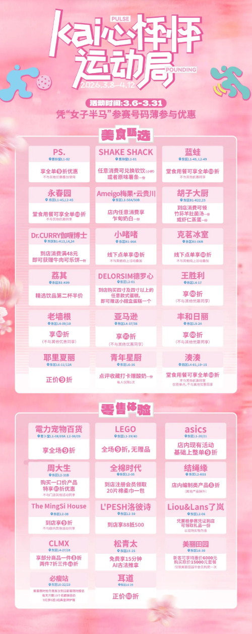 气温回升,春困来袭,正值初遇樱花季的浪漫时节,凯德集团于长宁来福士广场活力开启“KAI心怦怦运动局”,以一场沉浸式春日盛会,唤醒整座城市的律动与热情。本次活动周期从2026年3月8日持续至4月12日,借势女神节节点,通过场景营造与福利放送双重驱动,全面激活春日消费活力,为市民打造可参与、可体验、可共鸣的理想生活场景。 热“AI”大放送:长宁来福士广场一站式满足消费新需求 为让春日福利惠及更多市民,...