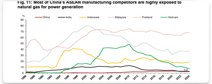 一个极其残酷的现实: 东南亚的弱点:泰国、马来西亚、印尼等东盟国家,其发电结构对天然气的依赖度极高(部分甚至高达60%-70%)。在全球LNG(液化天然气)价格受地缘冲突(如霍尔木兹海峡危机)波动时,这些国家的工业电价会瞬间暴涨。 中国的护城河:相比之下,中国的天然气发电占比微乎其微(红线几乎贴地,约3%)。中国电力的基石是煤炭(拥有自主定价权)和新能源(全球最大规模)。 结论:当东南亚工厂因为交...