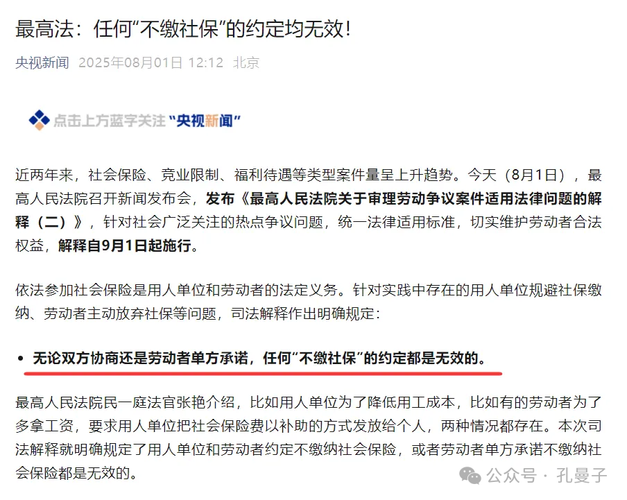 最高法新规2025年9月1日起,用人单位与劳动者任何形式的"不缴社保"约定均属无效。明确社保缴纳是法定义务,具有强制约束力。 2024年就业人口7.34亿,完整缴纳五险仅2.46亿人(占比33.5%)。灵活就业人口超2.4亿,社保覆盖存在巨大缺口。 北京最低社保个人月缴716元,灵活就业者需翻倍(近1500元)。骑手群体参保意愿调查:23.5%拒缴,38.9%仅愿承担5%。 新规会让中小企业用工成...
