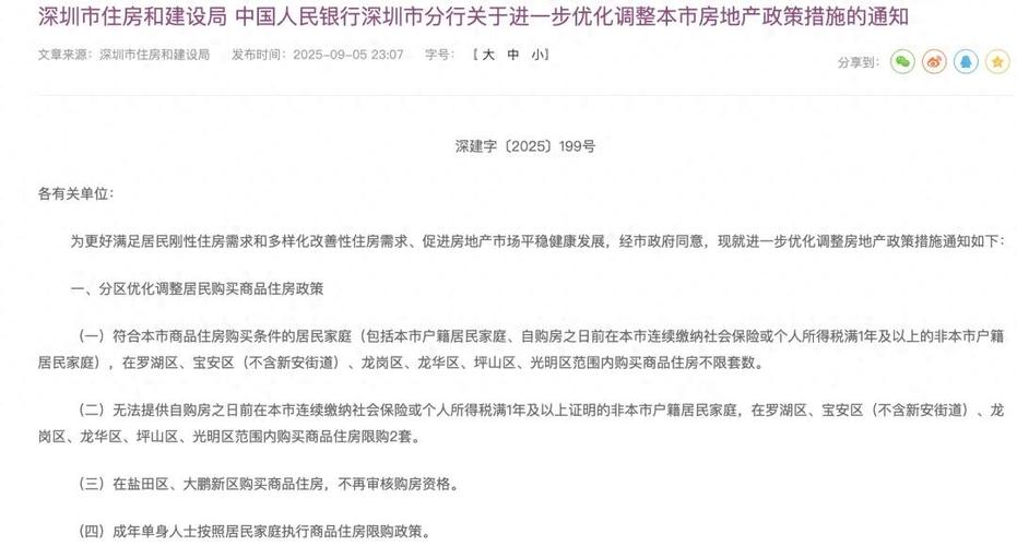 来源:每日经济新闻 9月5日深夜,深圳楼市再次迎来松绑。 深圳市住建局、中国人民银行深圳市中心支行联合发布房地产新政,在购房资格、企业购房限制、房贷利率三方面打出组合拳,自9月6日起正式施行。 根据新政,非深户即便未缴满1年社保或个税,也可在罗湖、龙岗等多个区域限购2套住房;盐田、大鹏新区完全取消购房资格审核;企业购房限制大幅放宽,非核心区域无需资格审核;房贷利率不再区分首套与二套,由银行自主定价...