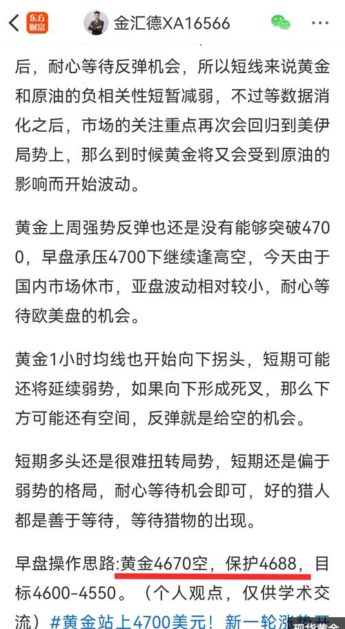 $黄金/美元(FORPM|XAU)$ 金汇德手XA16566:黄金或将延续跌势,晚间继续围绕4680-4700区间空 日内黄金早间急跌,下探4600后,随后反弹,分析布局4670一线布局空,午后给到了4643一线,有所收获,实盘也提示离场! 延续下午最高探4705附近,短期依旧多空来回反复,但上周五的阴线,已经确立了一部分跌势,短期反复,或在酝酿跌势,思路上逢高空的逻辑不变,晚间关注4680-47...