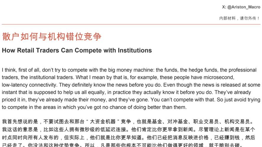 散户如何击败机构? TrevorNeil分享他40年的交易经验(Trevor于1974年开始他的职业生涯,曾任美银商品交易员,T-Capital的对冲基金经理和彭博全球技术分析主管),关于个人交易者如何在市场中获得优势: 1)散户不要正面和机构拼速度、拼通道、拼新闻获取能力,而要去那些机构没有明显优势、甚至反而有结构性劣势的战场。所以,第一原则不是提高自己去追上他们,而是避开那些你根本不可能赢的赛...