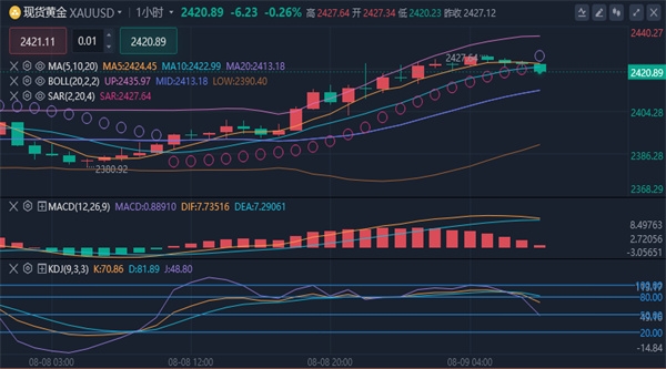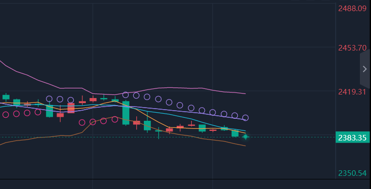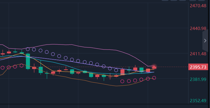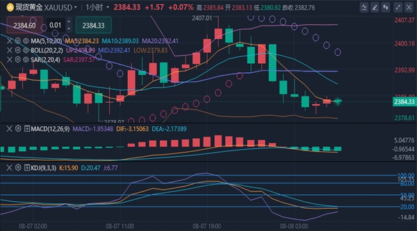8月7日(周三)欧市盘中,现货黄金小幅震荡,目前交投于2395.73美元/盎司附近。尽管对美国9月降息的预期和中东地缘政治紧张局势升级仍给金价提供一些支撑。中银国际环球商品市场策略主管傅晓表示:"主要受美元走强的影响,黄金仍然有些疲软......但黄金的宏观环境相对积极,因此我们可能会在短期内看到黄金的一些区间波动。黄金日线收一阴线,今日黄金开盘价格在2390附近,目前整体行情走势还是处于空头趋势...
