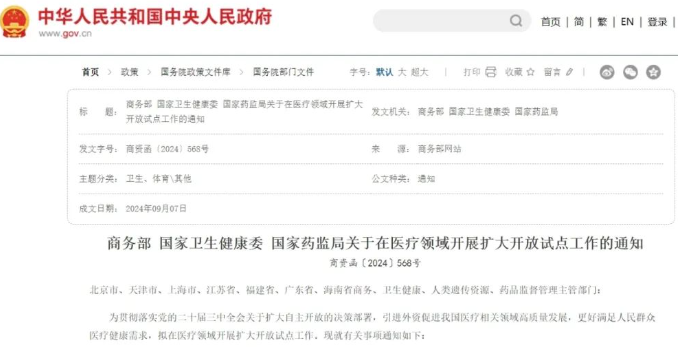 2024年9月8日,商务部、国家卫生健康委和国家药监局联合印发《关于在医疗领域开展扩大开放试点工作的通知》,拟允许在北京、上海、广州、深圳和海南全岛等9个地方设立外商独资医院(中医类除外,不含并购公立医院)。同时发布的还有关于在医疗领域开展扩大开放试点工作的通知。通知指出,在自由贸易试验区和自由贸易港内,将允许外商投资企业涉足人体干细胞、基因诊断与治疗技术的开发与应用领域。消息刺激下,今...