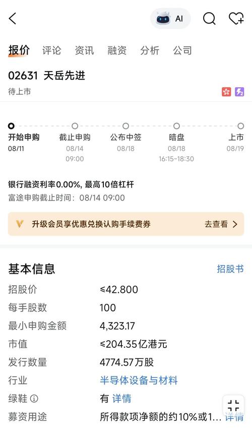买股票就是买公司的未来,大家想了解哪家上市企业,可以写在评论区 2025年8月11日,天岳先进(2631)在港交所开启申购,8月14日截止申购 今天,我们来给大家分析港交所新股——天岳先进(2631) 我们会从天岳先进的主营业务、财务数据、发行计划、申购策略情况等进行分析 一、主营业务 山东天岳先进科技股份有限公司成立于2010年11月,是一家专注于碳化硅单晶衬底材料研发、生产和销售的科技型企业。...