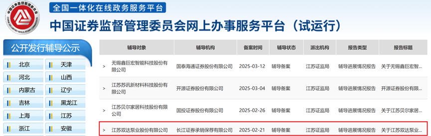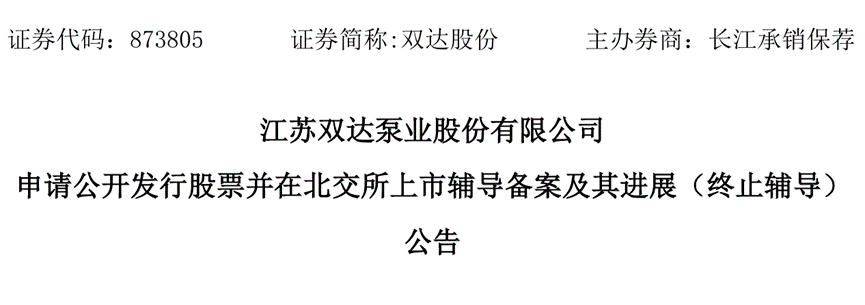 8月12日,新三板挂牌公司双达股份(873805)公告披露,鉴于公司发展战略规划调整,经与长江承销保荐协商一致,公司于2025年8月12日与长江承销保荐签署了《江苏双达泵业股份有限公司与长江证券承销保荐有限公司关于向不特定合格投资者公开发行股票并在北京证券交易所上市之辅导协议之终止协议书》,长江承销保荐已于2025年8月12日向江苏证监局报送了终止辅导备案的申请材料,截至本公告披露时,江苏证监局尚...