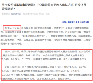 作为2025年首家科创板IPO上会前取消审议的企业,节卡机器人股份有限公司(下称“节卡股份”)的上市遇阻绝非偶然:临上市收入确认从“验收”改“签收”,2022年营收踩线2.81亿元科创板门槛,但收现比大跌、客户数据存差异;核心技术绑定上海交大,核心零部件外采;报告期内持续亏损、业绩预测偏差大;频繁下调募资额,并拟5倍豪赌扩产,合理性遭广泛质疑。 多重风险之下,节卡股份科创板上市之路冲满荆棘。 1、...