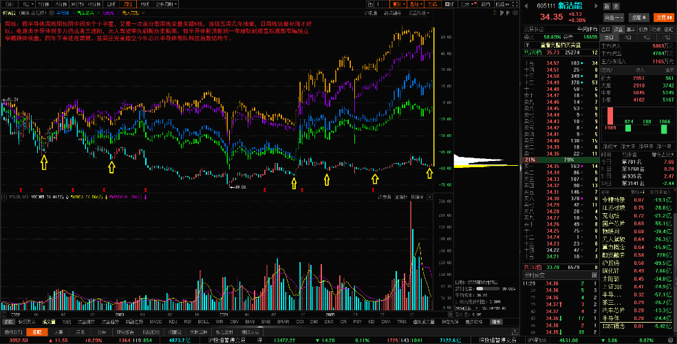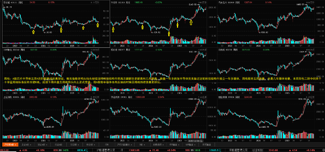 - 周线:A股芯片半导体五周4连阳假跌破后真突破,相关指数老鸭头抬头继续演绎科技结构牛将再次刷新历史新高和几年新高。横盘一年多的加半导体完美躲过这轮科技结构牛独立一年多箱体,周线维持五周地量,也是几年箱体地量,本周阳包二阴中间夹个十字星周线标准反转关键K线,迎接下周开盘五周线拐头向上正式变盘,假A股假半导体也有反抽的时候日周线持续倍量更好玩。