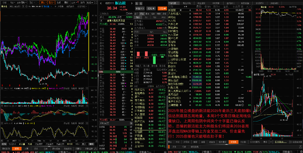 $无人驾驶(BK0802)$$充电桩(BK0700)$$碳化硅(BK0977)$ 2025年独立横盘的新洁能2025年最后三天底部爆5倍达到底部五周地量,本周3个交易日确定周线倍量缺口,上周阳包阴中间夹个十字星已确认反转。悲催的新洁能主力和股东们将迎来2026首周开盘出现MACD零轴上方金叉挂二档,价走量先行!2025悲催也只能咽在肚子里!