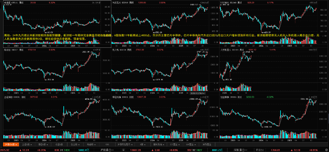 $无人驾驶(BK0802)$$充电桩(BK0700)$$碳化硅(BK0977)$ 今日周线收官,芯片半导体七八连阳周线长阳,两个月反杀跑输半导体的假半导体新洁能20cm+后没人玩,今日起码超级地量半年以上,也是几年独立底部地量。 下周年线收官战,2025芯片半导体指数翻番科技结构牛收官已成大局。