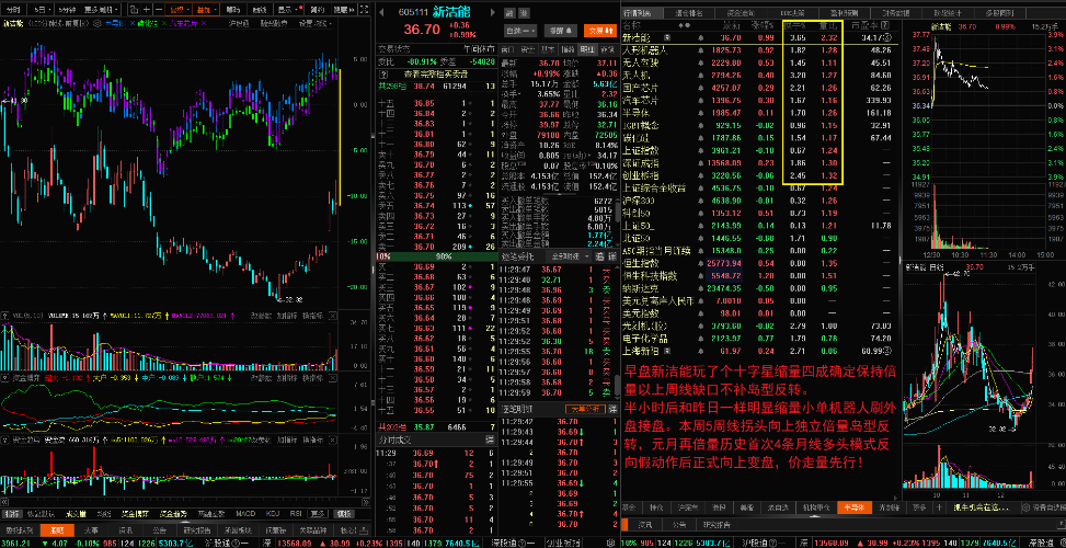 $无人驾驶(BK0802)$$充电桩(BK0700)$$碳化硅(BK0977)$ 早盘新洁能玩了个十字星缩量四成确定保持倍量以上周线缺口不补岛型反转。 半小时后和昨日一样明显缩量小单机器人刷外盘接盘。本周5周线拐头向上独立倍量岛型反转,元月再倍量历史首次4条月线多头模式反向假动作后正式向上变盘,价走量先行!