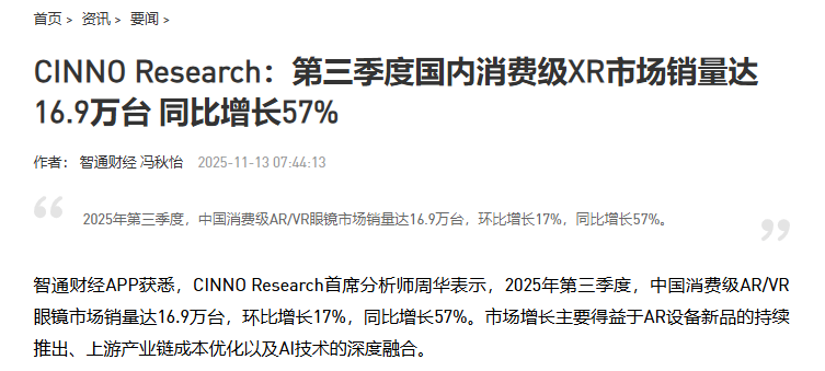 XR市场爆发前夜,翰博高新凭产业链卡位抢占先机 当CINNOResearch的数据揭示2025年第三季度国内消费级XR市场销量达16.9万台、同比激增57%的强劲增长态势时,一个明确的产业信号已然浮现:在AR新品密集落地、AI技术深度融合与产业链成本优化的三重驱动下,XR行业正迈入规模化爆发的关键窗口期。而深耕半导体显示核心零部件领域的翰博高新,凭借与XR产业的深度绑定、技术布局的前瞻性及稳固的产...