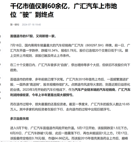 $广汇汽车(SH600297)$梦醒了才知道自己还在梦中,广汇汽车的退市给市场敲醒了三座大钟,第一座钟是高送转,试问如果广汇汽车没有高送转,以它目前的市值,股价最低也要在6元以上吧,所以后面高送转的公司肯定要反思了,你还敢不敢玩文字游戏!第二座钟是夕阳产业,广汇汽车是干4S店的,但现在很多汽车都采用直销了,也就是人家不经过二道贩子从中赚差价了,这一点要向特斯拉的马斯克致敬,把经销利润直接让给消费...