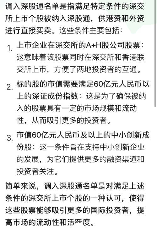 $日发精机(SZ002520)$ 调入深股通意味着该股票被纳入了深港通机制下的深股通标的范围。深港通是指内地和香港之间的股票市场互联互通机制,旨在促进两地间的经济合作和贸易往来。调入深股通后,符合条件的香港用户将能够通过深股通买卖这些股票。以下是调入深股通的利好影响: 北向资金的直接买入:被纳入深股通意味着北向资金可以直接买入该公司的股票,这可能会增加股票的流动性和交易量。 市场认可度提升:调入深...