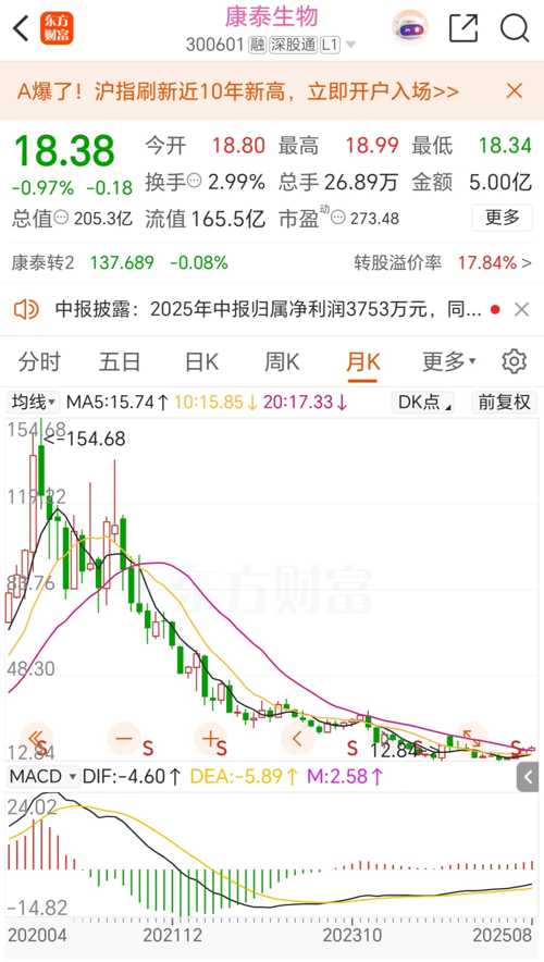 $深股通(BK0804)$$创新药(BK1106)$$康泰生物(SZ300601)$2020年8月至2025年8月,康泰生物从最高价每股154.68元跌到今日午盘的每股18.38元,其中最低价跌到每股12.84元。从最低价到今日午盘价,也仅仅反弹了大约40%。五年时间康泰生物下跌了十多倍,那么问题来了,如果康泰生物涨回十倍,也需要五年吗?