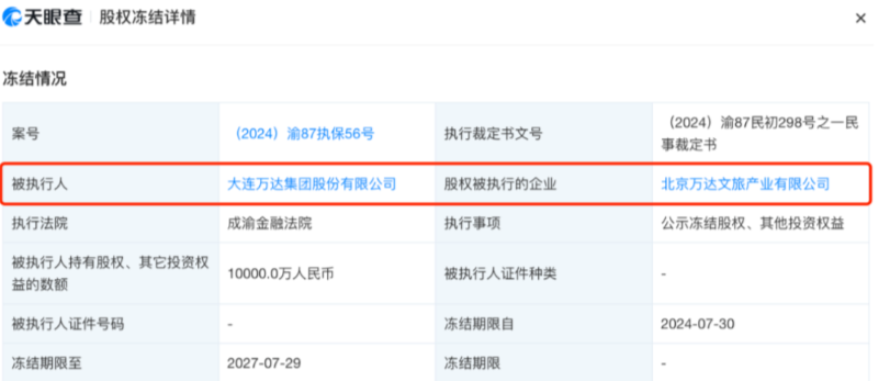 万达商管所持1亿股权被冻结。万达商管所持一万达广场股权被冻结。天眼查法律诉讼信息显示,近日,大连万达商业管理集团股份有限公司新增一则股权冻结信息,股权被执行的企业为济宁太白路万达广场有限公司,冻结股权数额1亿人民币,冻结期限自2024年7月19日至2027年7月18日,执行法院为横琴粤澳深度合作区人民法院。济宁太白路万达广场有限公司成立于2011年8月,法定代表人为吴华,注册资本1亿人民币,由大连...