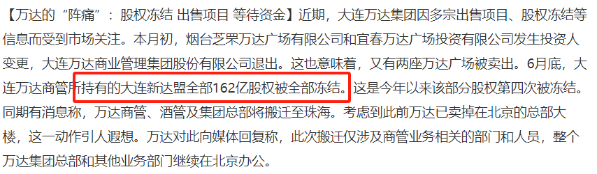 最近大连万达集团又上了热搜。这次不是因为什么惊天动地的并购,而是因为1亿元股权被冻结的消息。大连万达集团持有的北京万达文旅产业有限公司1亿元股权被冻结了。今年以来,大连万达商管所持有的大连新达盟162亿股权已先后四次被冻结,只有一次解冻。此外,大连万达商管持有的其他公司股权也频繁遭遇冻结。不少人直呼"万达要完"。可事实真的如此吗?先别急着下定论。在股权被冻结的背景下,王健林干了件很新奇的事—在珠海...